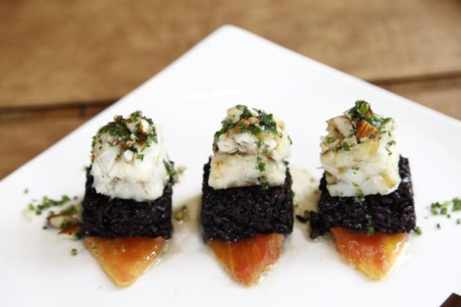 Bacalhau ao molho Pil Pil com arroz negro e amêndoas