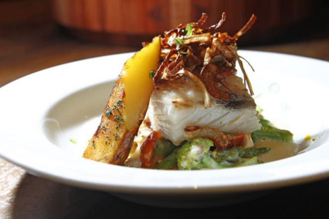 Bacalhau com pupunha, batata e crispy de cebola