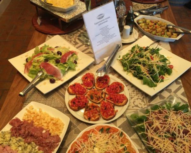 Buffet de antepastos, saladas e pratos assados em forno à lenha