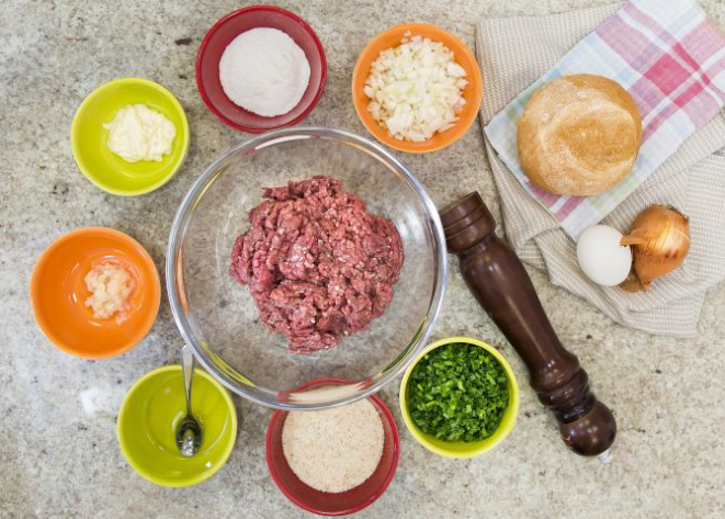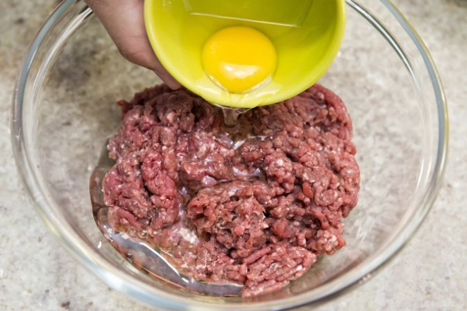 1. Num bowl adicione todos os ingredientes à carne e misture bem.