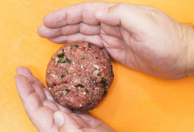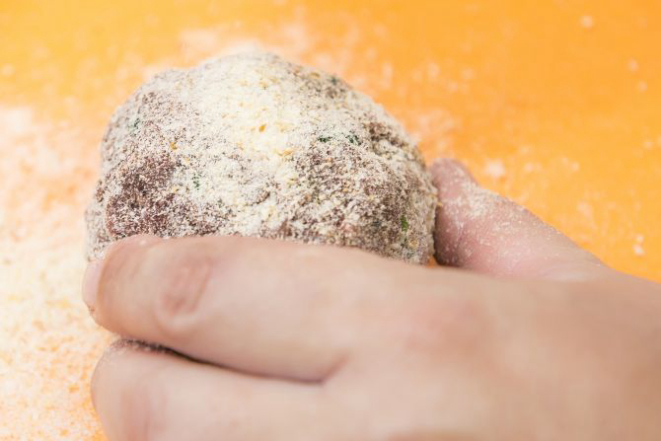 2. Faça bolinhos de 150 g cada. Se preferir, para facilitar a cocção interna, deixe em formato mais achatado. Passe na farinha de rosca para obter mais crocância (opcional).