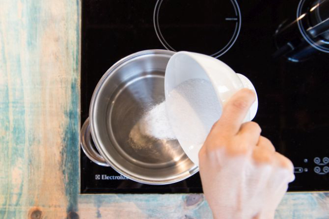 Em uma panela, ferva 2 litros de água e assim que começar a borbulhar, desligue o fogo. Coloque o açúcar e mexa até dissolver.