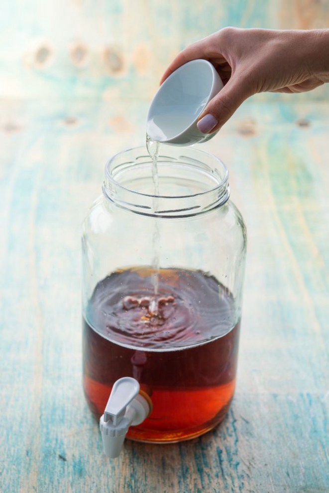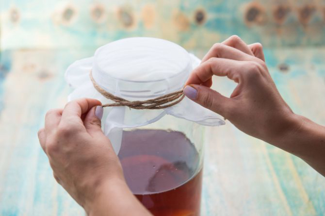 Coloque o líquido em um recipiente de vidro e acrescente o vinagre de maçã (ou o chá fermentado).