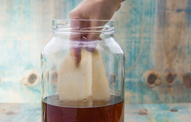 Coloque o scoby, ele é fundamental para o chá fermentar.