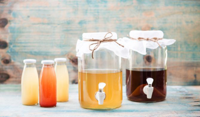 Encha garrafinhas ou potes de vidro com o kombucha até um pouco mais da metade. Preencha o restante com o suco de sua preferência e feche bem. Coloque as garrafas fechadas em ambiente seco, fresco, longe da luz e deixe-as descansar de 3 a 5 dias. Refrigere antes de consumir.