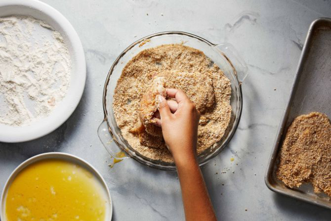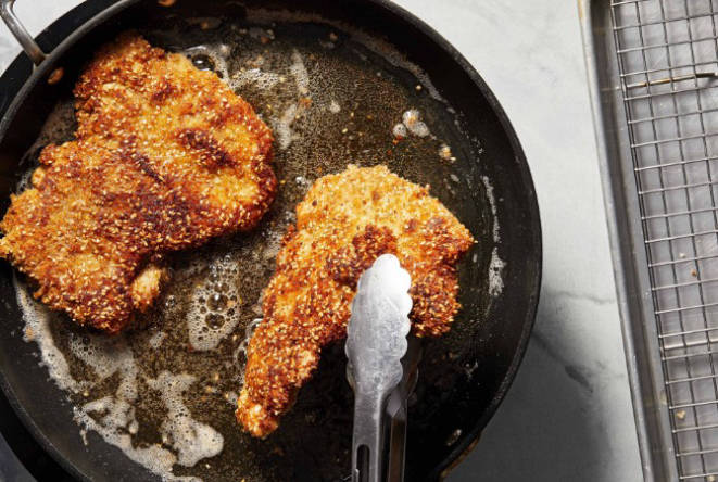 Como os cozinheiros kosher em Israel fazem há décadas, ela frita a carne em óleo em vez de manteiga. Ela aproveita também para misturar sementes de gergelim torrado à farinha Panko para um toque crocante extra. Outra dica importante é a de fazer uma breve pausa antes de levar o frango à frigideira – isso faz com que a casquinha não se descole da carne.