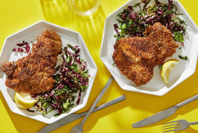 Muitas culturas culinárias já puseram sua própria versão do prato clássico alemão schnitzel, em geral feito com carne de vitela empanada. A autora norte-americana baseada em Tel Aviv, Israel, Adeena Sussman, considerada uma especialista em desenvolver e adaptar receitas com um toque mais moderno, propõe o preparo usando coxas de frango.