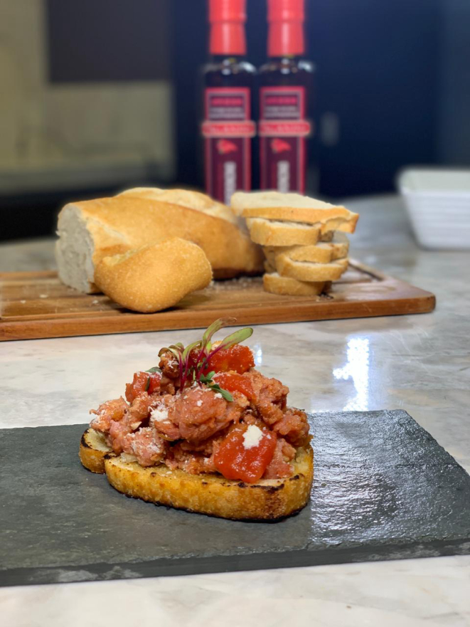 Bruschetta de linguiça Blumenau com Azeite de Pimenta Vermelha Paganini