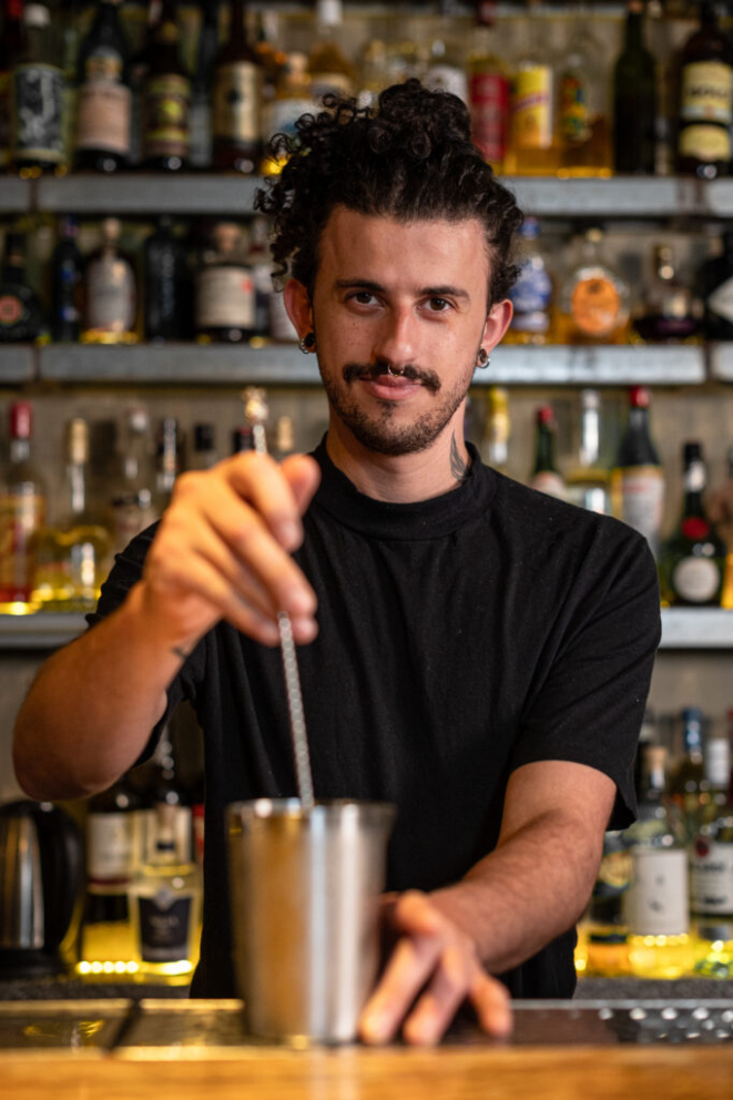Leo Oliva tem 28 anos, é natural de Petrópolis, serra do Rio de Janeiro e atua há dois anos no ramo da coquetelaria e há oito no universo dos cafés especiais. Sua entrada no bar foi motivada por um campeonato: ele é o campeão nacional de 2025 do Coffee in Good Spirits, a mesma competição que Ariel venceu em 2018 e que celebra os melhores preparos de bebidas alcoólicas com café.