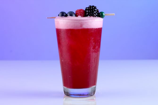 Vodka, soda artesanal de jabuticaba com infusão de limão kaffir, hibiscos e suco de limão siciliano