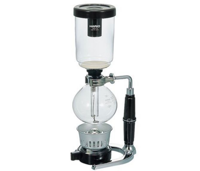 Também conhecida como globinho. São dois globos de vidro, sendo um deles com um funil e um filtro, uma base e a chama. Para passar o café, você coloca água no globo de baixo e encaixa a parte superior. A água quente sobe para o globo superior. Ao retirar a chama, conforme o globo inferior esfria, a água com o pó desce e ao passar pelo filtro, o pó fica retido.