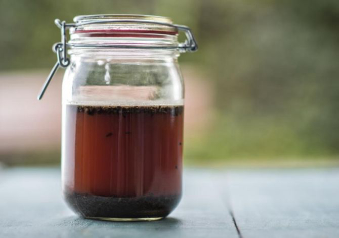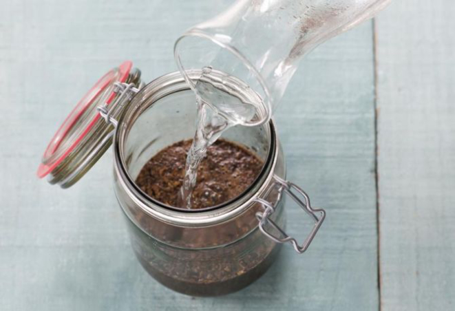 1. Em um recipiente de vidro com tampa bem vedada, coloque o pó e em seguida a água fria.