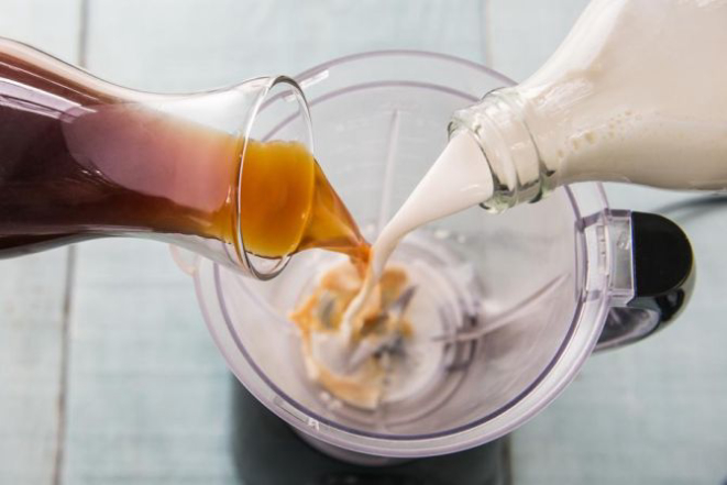 4. Se optar por um café com leite, bata o leite e o café em um liquidificador até formar espuma. Sirva imediatamente com gelo.