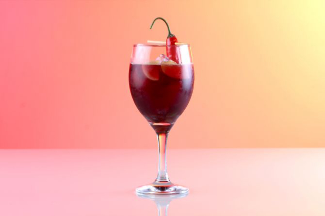 Cravo, canela em pau, maçã, laranja, uva, licor de laranja, suco de laranja, vinho tinto, soda limonada e pimenta-dedo-de-moça