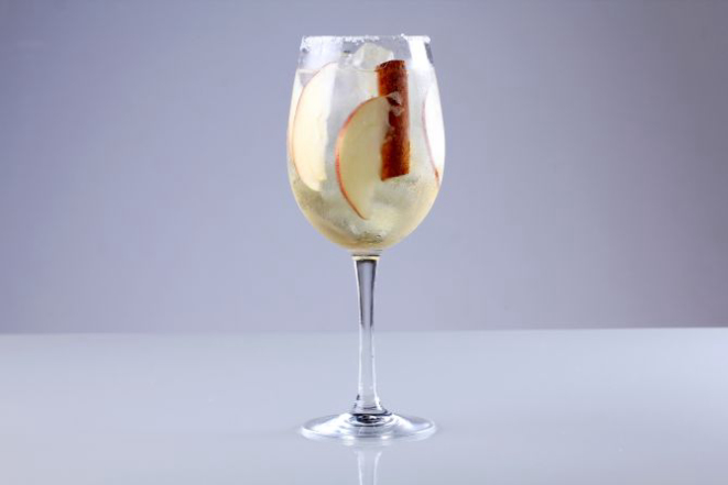 Vodka Absolut Vanilla, suco de maçã, canela em pau e uma fatia de maçã com borda de açúcar de baunilha