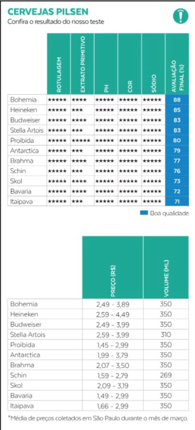 Foram testadas Skol, Brahma, Itaipava, Antarctica, Schin, Bohemia, Bavaria, Heineken, Stella Artois, Budweiser e Proibida. Os critérios avaliados foram rotulagem, teor alcoólico, extrato primitivo, acidez ideal (pH), características organolépticas (cor e volume de ar), sódio, preços e disponibilidade de venda.