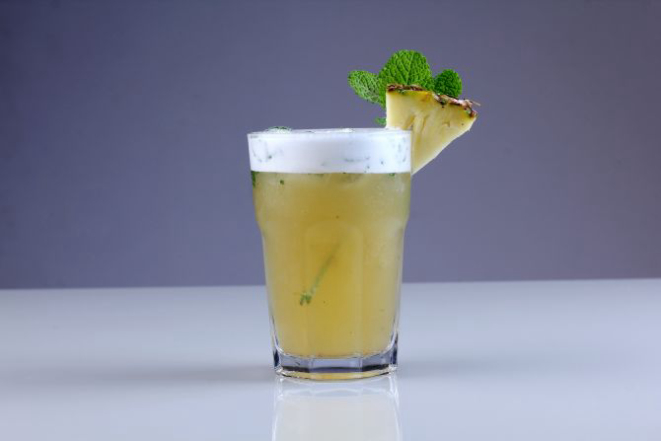 Tequila, suco de abacaxi, Amaretto, hortelã e gelo
