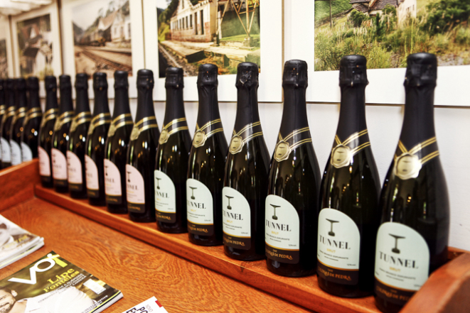 Depois disso, passam pelo processo de degorgement, quando as leveduras responsáveis pela fermentação do vinho são retiradas e aí sim é colocada a rolha. Depois, são rotuladas e viram oficialmente os espumantes Tunnel. Há quatro versões maturadas na Colinas de Pedra: Nature, Brut Rosé, Brut e Moscatel Rosé. Todo o processo realizado lá é o clássico da produção de espumantes, conhecido como champenoise (o mesmo usado nos Champagnes franceses).