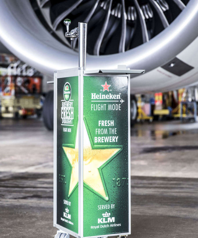 A companhia aérea holandesa KLM, por sua vez, oferece chope em alguns voos desde agosto de 2016. A prática, se considerarmos a técnica tradicional de se fazer chope, é desaconselhada em aviões, pelos riscos de se ter gás carbônico para a pressurização da bebida dentro da aeronave. Assim, em conjunto com a Heineken, a KLM desenvolveu uma tecnologia para utilizar ar da cabine para a pressurização, chamada de The BrewLock.