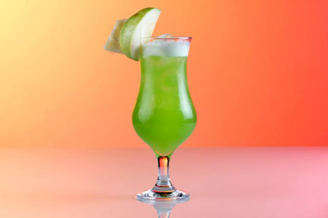 Malibu, suco de abacaxi e Monin maçã verde