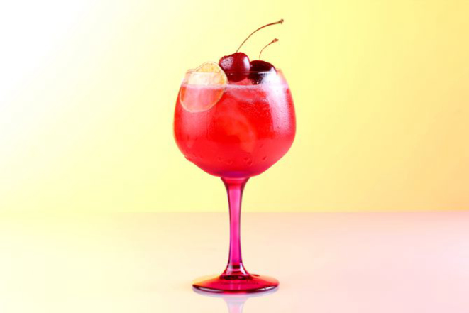 Gim Bulldog, xarope artesanal de amora silvestre, tônica artesanal, cereja e laranja desidratada. Aromatizado com água de flor de laranjeira
