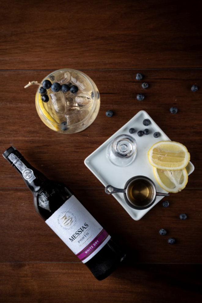 Encha a taça com gelo. Em seguida adicione diretamente no recipiente o vinho do Porto branco e a água tônica. Mexa a mistura e complete com fatias de limão-siciliano e blueberries para decorar. Importante: bom substituto para quem gosta de gim, o Porto Tônica também cai bem com canela e outras especiarias, além de manjericão.