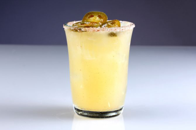 Tequila José Cuervo Ouro, Curaçau Triple Sec, suco de abacaxi, gengibre, pó chilli e pimenta jalapeño