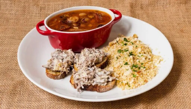O que é: Dobradinha à moda Maria Flor, com feijão branco, paio, calabresa, costelinha defumada e temperos especiais. Acompanha dois minipães, pimenta caseira e queijo coalho com melado de cana.