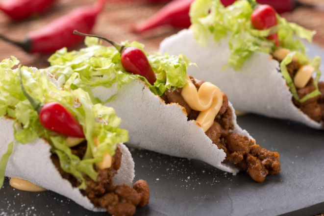 A tapioca ganhou as cozinhas por não conter glúten e graças a sua praticidade – principalmente quando passou a ser vendida hidratada, pronta para o preparo. Para um prato mais elaborado, o chef Sandro Duarte, instrutor do Curso de Chef de Cuisine e Restaurateur do Centro Europeu, usou o ingrediente já hidratado para substituir as tortilhas de milho, do taco mexicano. “É uma opção de receita leve, rápida e que agrada aqueles que são celíacos”, conta a o chef. Duarte não misturou nenhum ingrediente à massa (nem sal) por acreditar que o recheio já trazia bastante personalidade com a pimenta chilli.