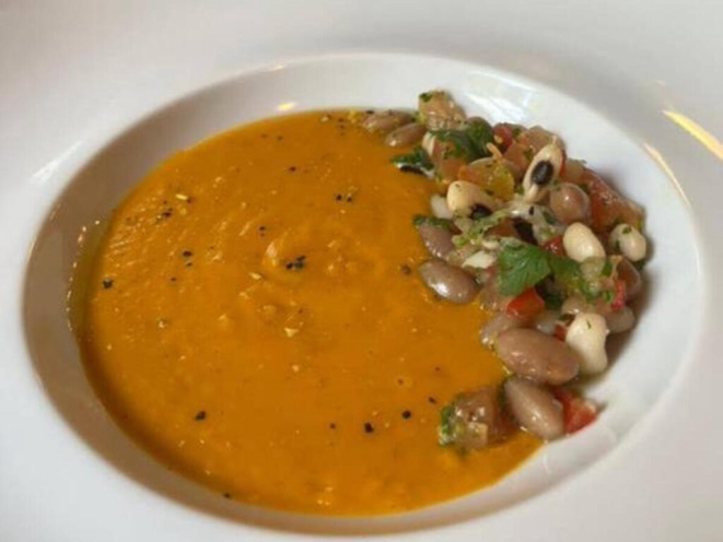 Sopa fria de abóbora, gengibre coentro e vinagrete de feijão