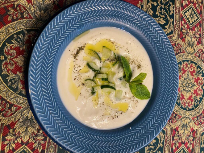 - Decore com hortelã fresca, pepino em cubos e azeite de oliva.