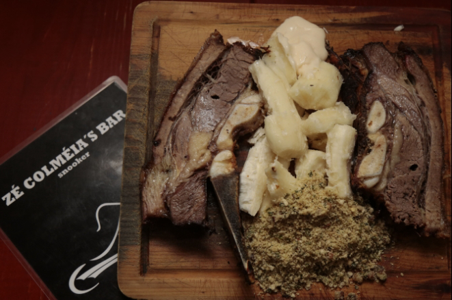 A costela chega acompanhada de aipim e uma farofa da casa, que também faz sucesso. Embora não conste como item no cardápio, também pode ser pedida separadamente.
