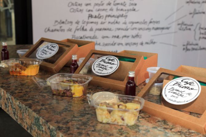 Como prato principal, quatro opções. Os blintzes de legumes ao molho de cogumelos frescos trazem a influência judaica. Nos charutos de folha de parreira servidos com cuscuz marroquino está representado o islamismo. A bacalhoada com ora-pro-nóbis carrega a tradição católica, e o xinxin de galinha com cuscuz de milho, a das religiões afro-brasileiras. Para beber, água, vinho e suco de uva com gengibre. De sobremesa, coalhada com mel e amêndoas. Tudo isso para comer na hora ou levar para casa numa caixa que faz lembrar um altar de santa – inspiração do fast-food.