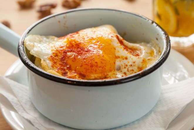 R$ 8, o A lo pobre: batata em fatias, assada com cebola, pimentão e azeite de oliva, coberta com ovo frito e páprica doce.