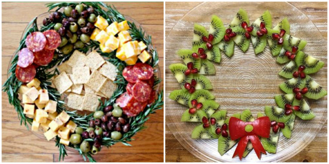 Outra ideia é usar frutas ou petiscos, como queijo, salame e azeitonas para compor uma guirlanda de Natal.