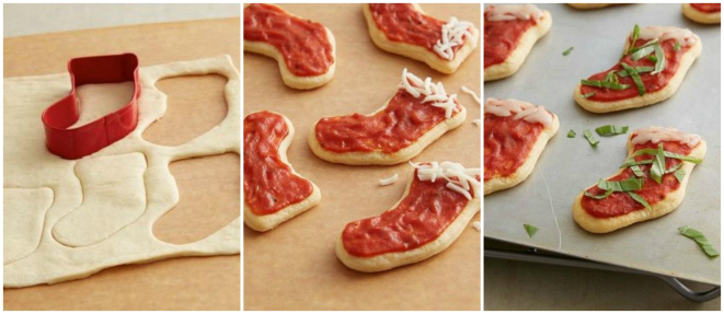 As meias de Natal podem ser feitas de pizza ou de salsichas decoradas com cream cheese ou patê.