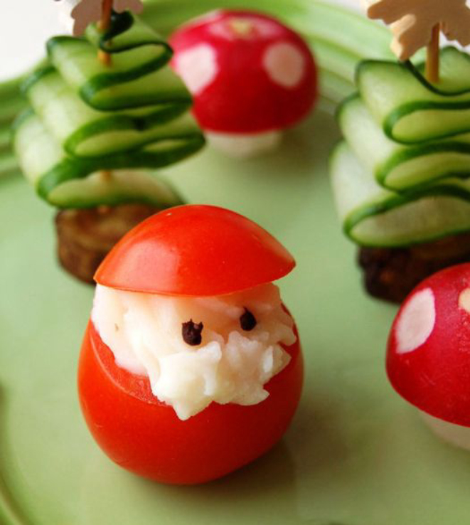 O papai Noel também pode ser feito com tomates-cereja recheados com o ingrediente de sua preferência. Pode ser purê de babatas, requeijão ou patê de queijo. Faça os olhos com pimenta-do-reino. Para acompanhar, crie uma árvore de Natal com pepinos fatiados e estruturados em um palito.