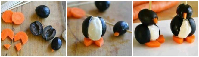 E que tal um pinguim feito de azeitonas, muçarela de búfala e cenouras?