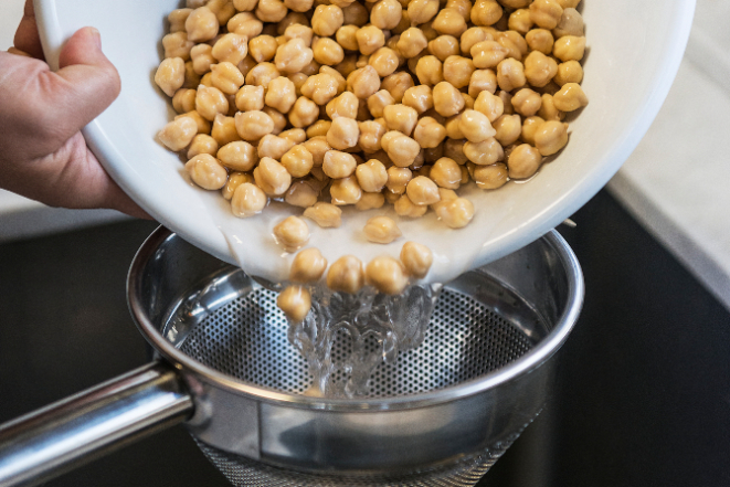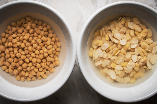 1. Em tigelas separadas, coloque o grão-de-bico cru e a fava seca de molho na geladeira de um dia para o outro. Isso fará os ingredientes dobrarem de tamanho.