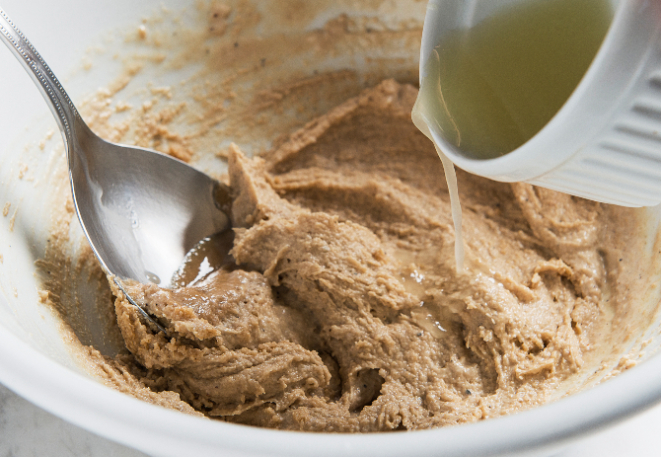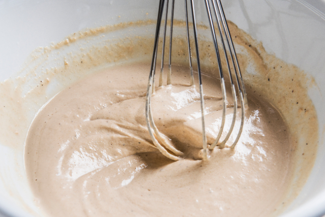 6. Para fazer o taratour, misture a tahine com o suco do limão e adicione a água aos poucos, até a pasta ficar com uma consistência cremosa.