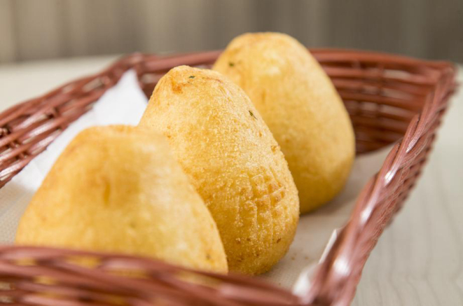 A massa é crocante e sequinha por fora com o interior bem macio. O recheio é de frango temperado com cheiro verde, salsinha, alho e ajinomoto, além do requeijão cremoso – que derrete por dentro com o calor da massa. Preço: R$ 4,50