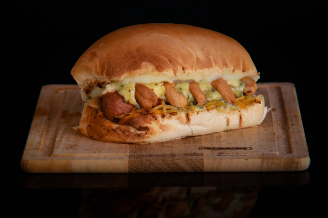 Junto do pão, da salsicha e da maionese, o lanche leva queijo gorgonzola, catupiry e o principal diferencial, castanha de caju. Além disso, a receita inclui purê de batata, tomate, milho, farofa e batata palha. Preço: R$ 12.
