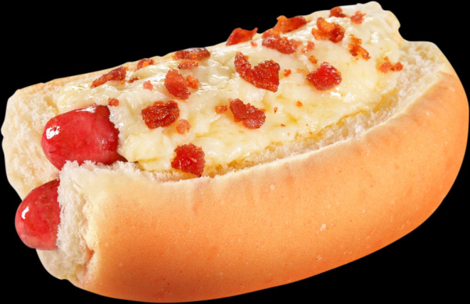 Au-Au Grill catupiry com bacon: pão Au-Au Especial, 2 salsichas tipo americana grelhadas, catupiry, bacon e maionese.
