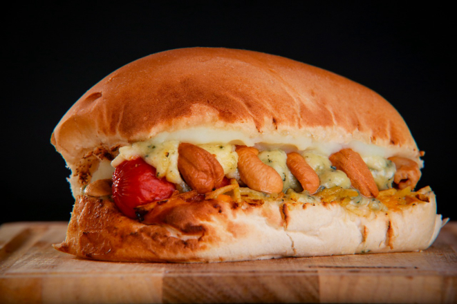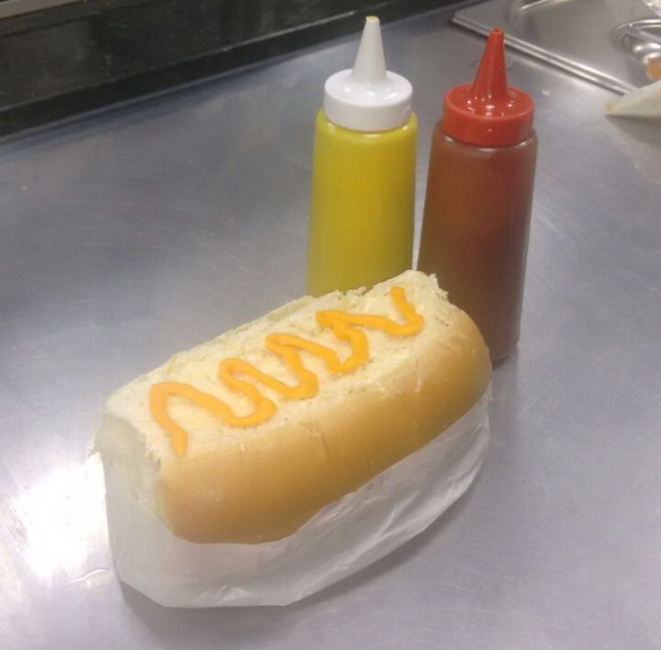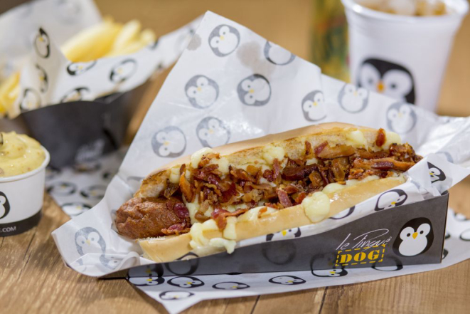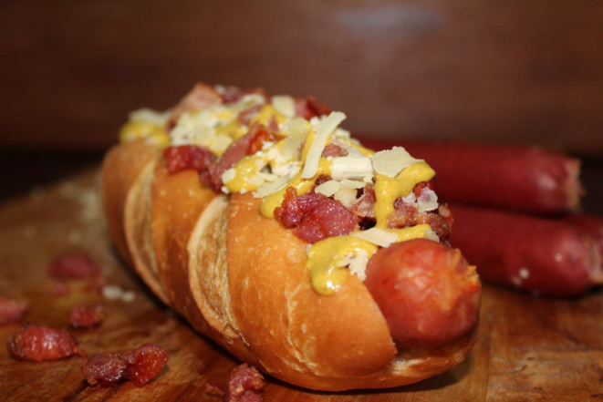 Hot Balboa: pão baguete, salsicha tipo americana, bacon frito, queijo parmesão italiano e mostarda Dijon.