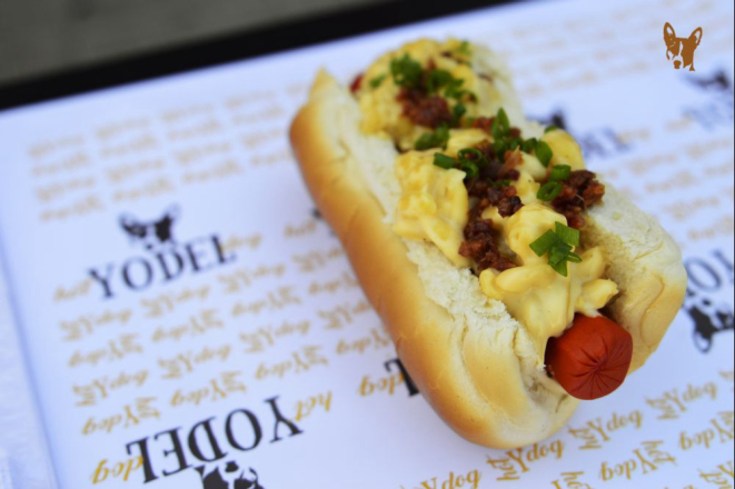 Mac’n cheese dog: pão, vina, mac’n’cheese (macarrão com queijo norte-americano), bacon e cebolinha.
