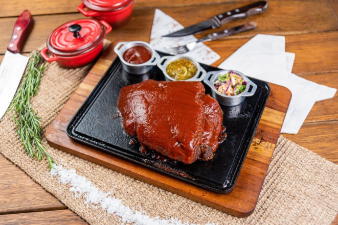 Mas já que hoje é dia de Super Bowl, o maior evento esportivo dos Estados Unidos, um churrasco como os norte-americanos fazem pode ser uma boa pedida. Se você não tem um pit smoker, a dica é cozinhar a carne na panela, garantindo um cozimento lento e desmanchando na boca. A finalização é feita na grelha ou frigideira para a crocância. O molho BBQ é pincelado para caramelizar.