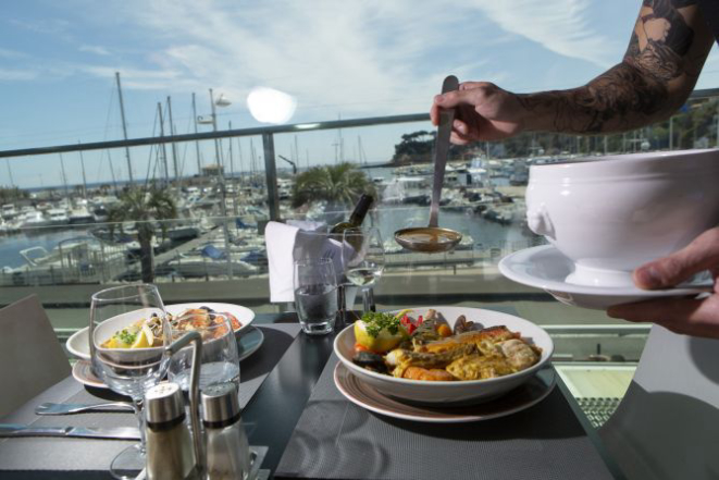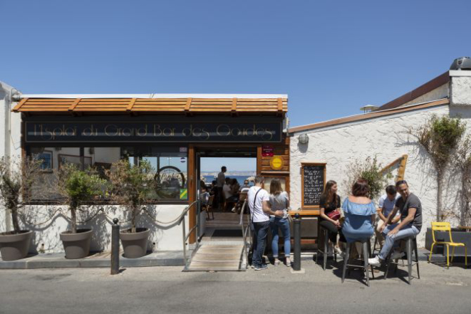 O terraço ao ar livre do L’ Esplaï du Grand Bar des Goudes está situado nas rochas, com vista para um pequeno porto pesqueiro; é o lugar aonde os marselheses vêm para um longo almoço de domingo.