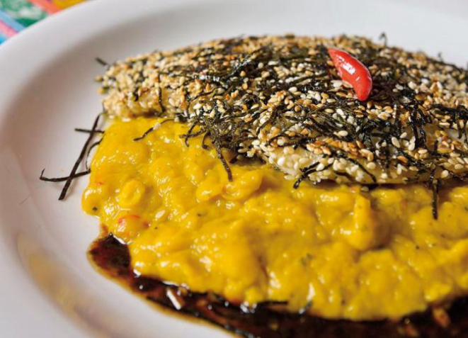 No linguado com crosta, a alga foi picada e misturada a outras especiarias como gergelim, sal, ervas e pimentas e utilizada para temperar o peixe. Pedacinhos da alga foram incrementados também ao purê de abóbora temperado com raspas de queijo provolone, que acompanha o prato.