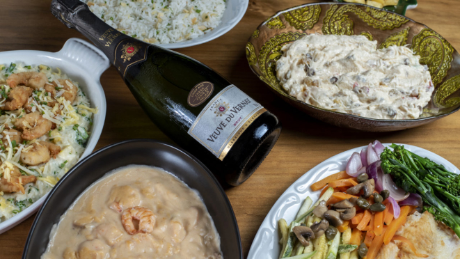 O restaurante francês L'Épicerie conta com várias opções para uma ceia completa. De entrada, o Quiche L'èpicerie, com salmão defumado, alho-poró e cogumelo paris, sai por R$ 99 (quatro fatias), enquanto o Salpicão, que serve seis pessoas, sai por R$ 98. Para prato principal, as opções são o Camarão na Nata (quatro pessoas, R$ 340), o Tourte à La Vinde (seis pessoas, R$ 280), o Rosbife de Mignon (quatro pessoa, R$ 298) e o Le Canard (duas pessoas, R$ 160). As porções de farofa, arroz e cuscuz marroquino, de 700 g, saem por R$90 cada.