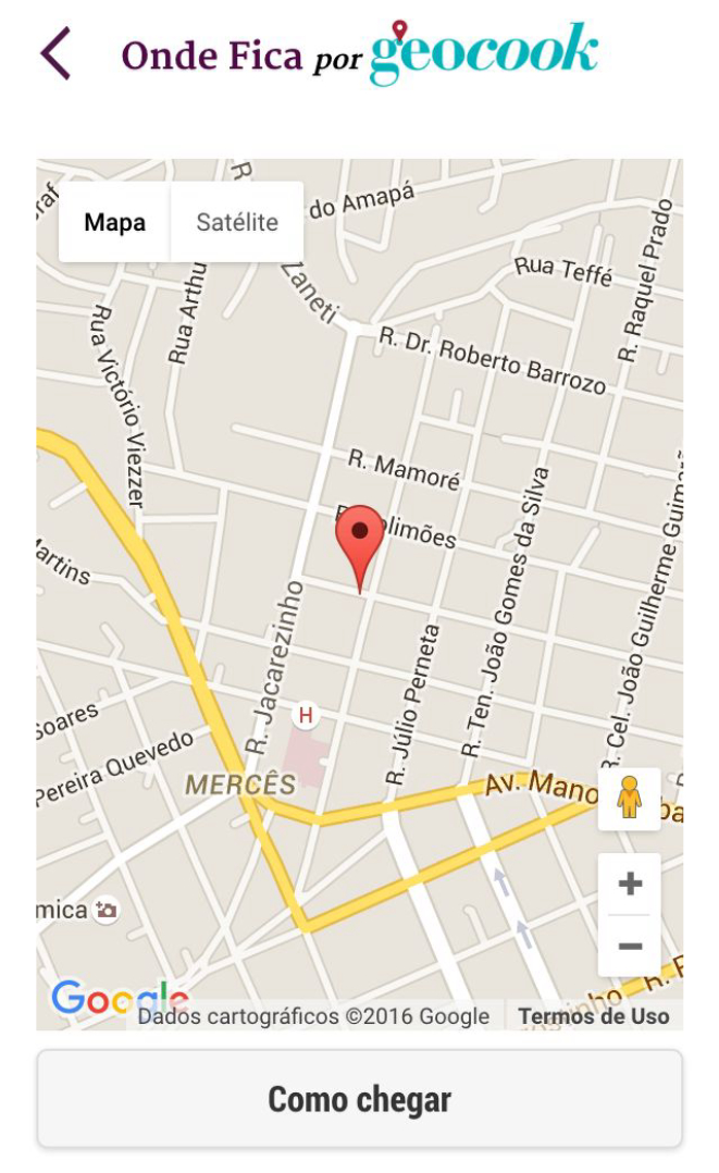 A busca pode ser feita por preço (R$ 39,90 ou R$ 49,90) e horário da refeição (almoço ou jantar). Ao clicar no restaurante escolhido, são apresentados os cardápios completos com uma breve descrição dos pratos. Ao rolar a página, é possível acessar, também, informações sobre o estabelecimento, horário de atendimento, cartões de débito e crédito aceitos, telefone e endereço. No final da página, o botão da ferramenta Geocook abre o mapa de localização do restaurante e é possível definir a rota de como chegar.